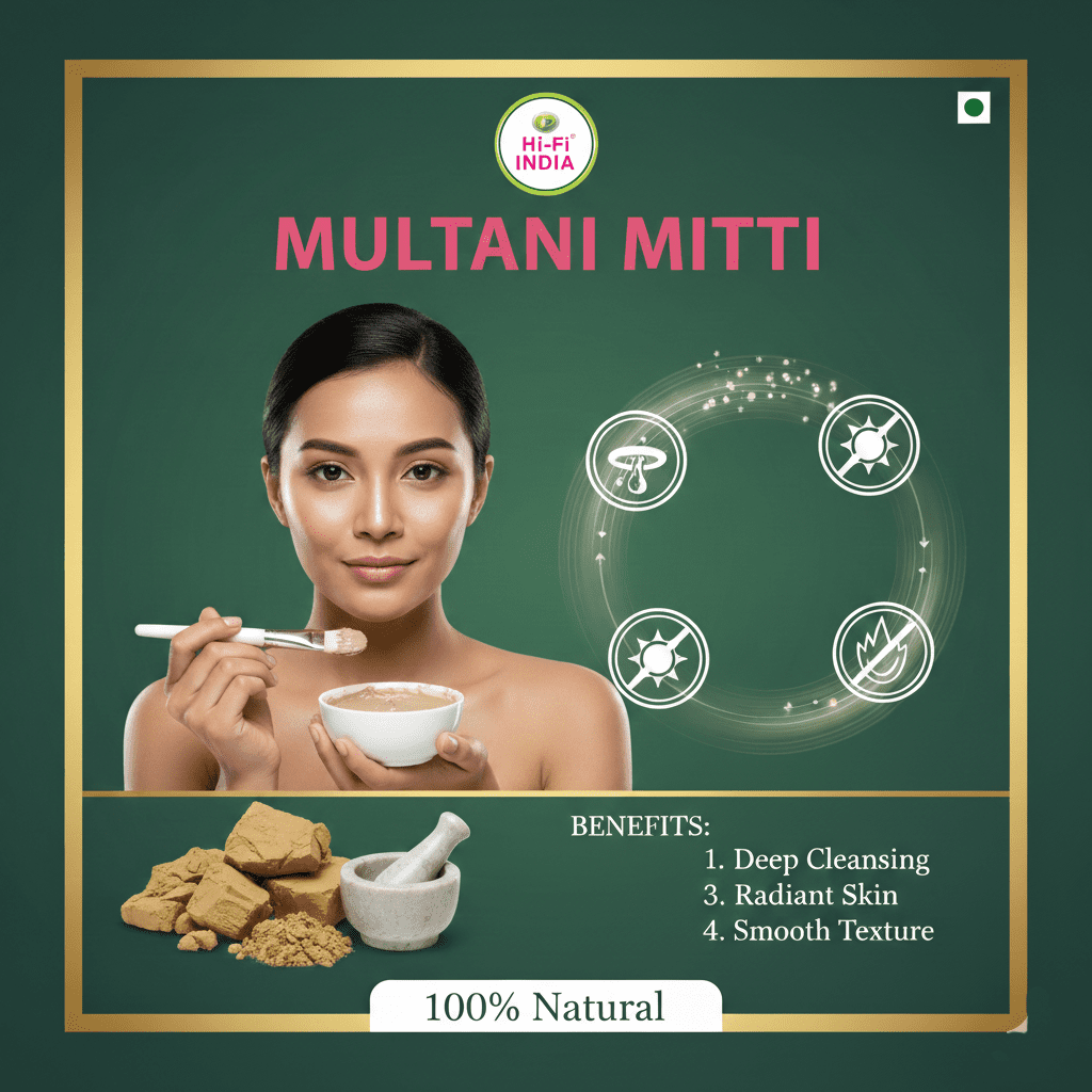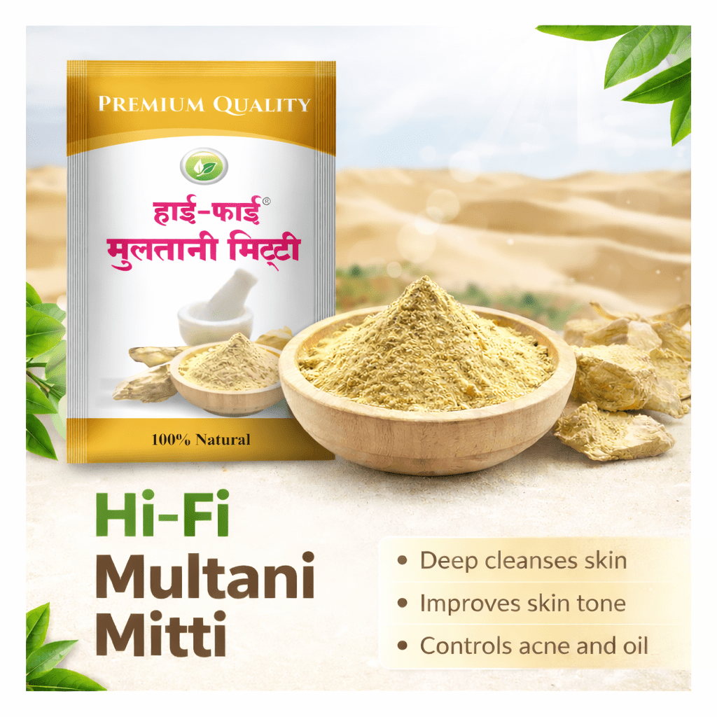 Hi-Fi Multani Mitti is a natural clay powder known for its deep cleansing and oil-absorbing properties. It helps purify the skin, remove excess oil, and leave the skin feeling fresh, smooth, and clear.