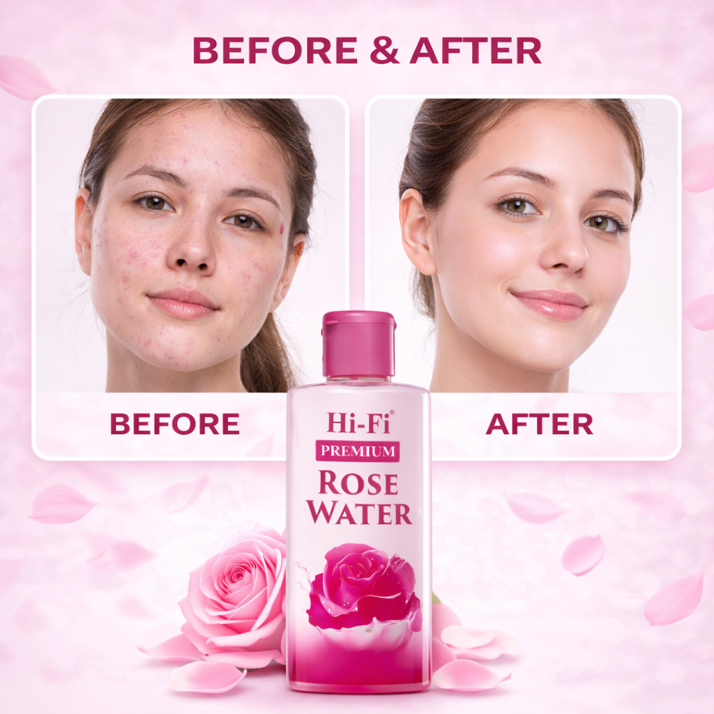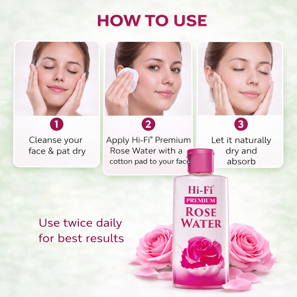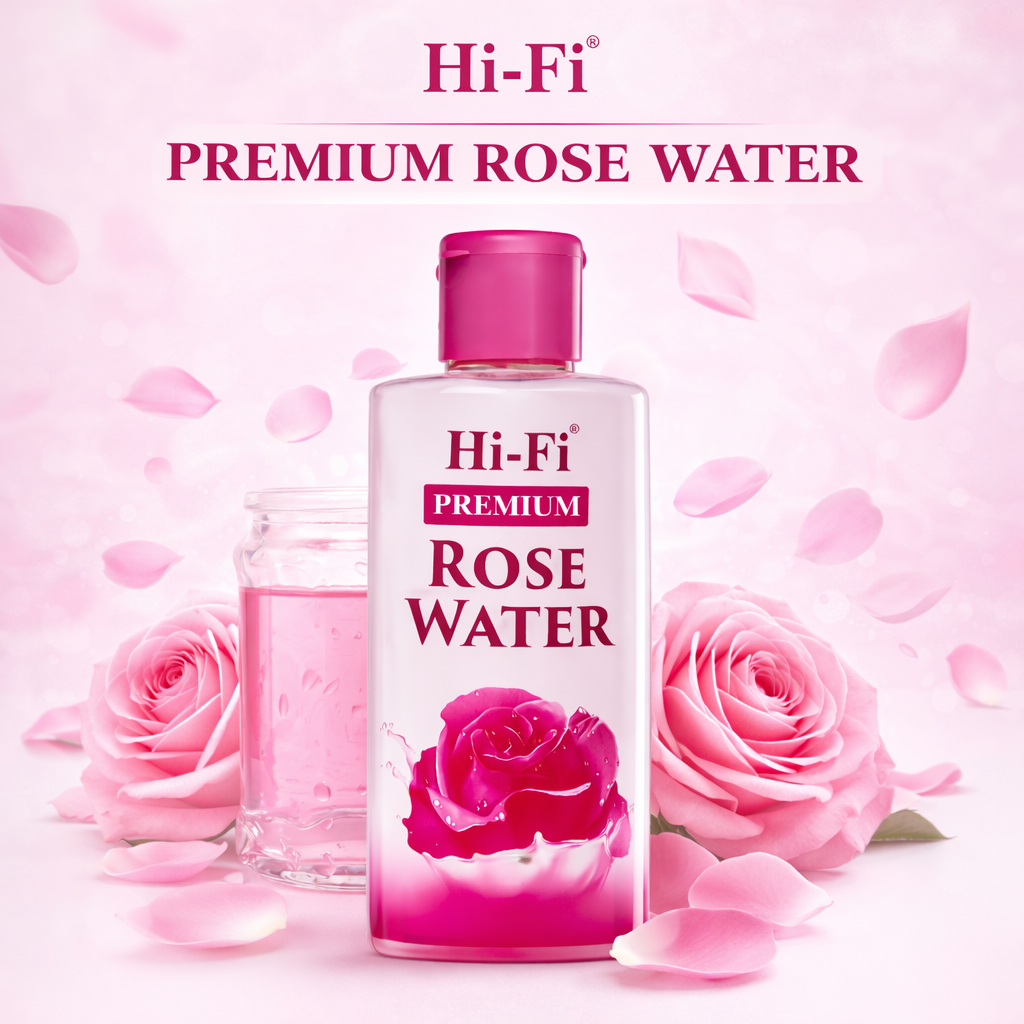 Hi-Fi Premium Rose Water is a gentle and refreshing skin toner that helps hydrate, soothe, and brighten the skin. It removes dirt, refreshes tired skin, and leaves a natural glow. This pack of 3 is perfect for daily skincare and travel use.