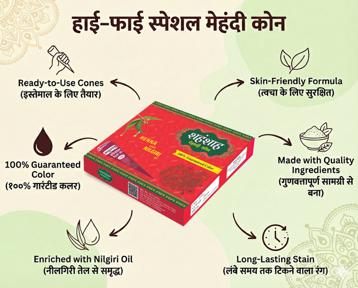 Shahenshah Mehandi Cone is perfect for creating clean, attractive, and long-lasting mehndi designs. It offers smooth application and helps you make fine detailing easily. This value pack of 12 cones is ideal for home use, salons, festivals, and special functions.