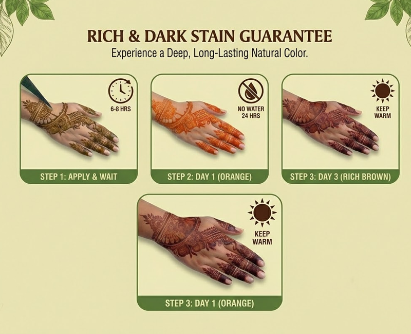 - Dark & beautiful stain: Gives a rich mehndi color for a traditional and attractive look.